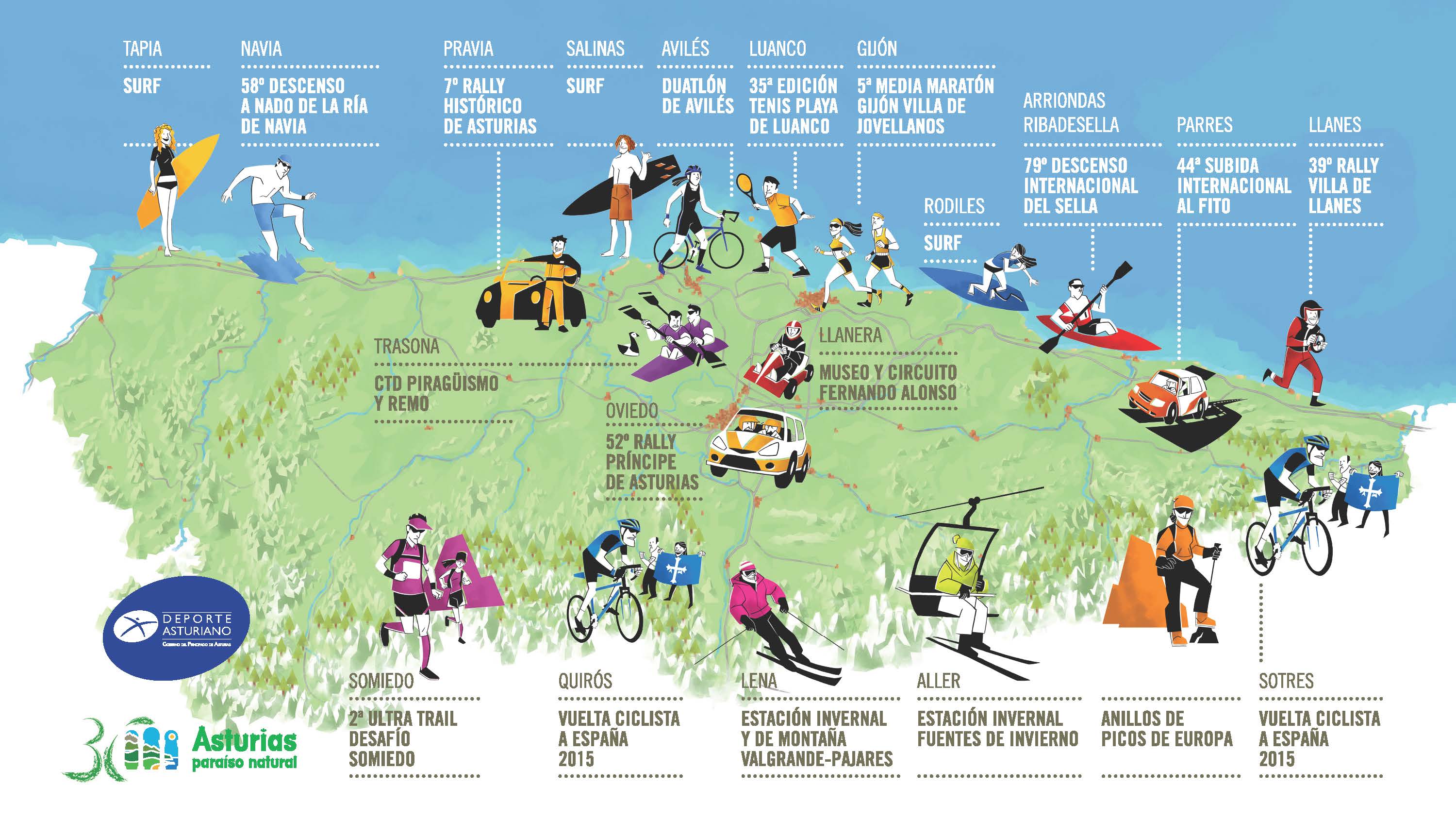 En dicho acto se presentaron algunos de los eventos deportivos más relevantes que se celebrarán en el Principado de Asturias durante el año 2015. Además, se hizo referencia a Anillos Picos de Europa, al CTD Piragüismo de Trasona (Corvera de Asturias), al Museo y Circuito Fernando Alonso (Llanera), a la Estación Invernal y de Montaña Valgrande-Pajares (Lena) y a la Estación Invernal Fuentes de Invierno (Aller). En la presentación se proyectaron fotos así como un mapa de Asturias con la representación de los distintos eventos y lugares.